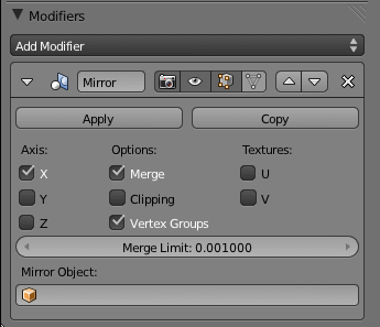 - Merge: The modifier creates one mirror vertex for each vertex in the model. This is also true for vertices which are located exactly on the mirror plane. In this case the vertices get duplicated. If you do not want that (which is in most cases), you will check the Merge option. This will remove doubles on the mirror plane.